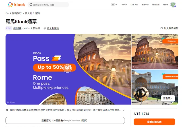 如果你想省錢,那就是各景點官網一一購票,有的一個月前就要搶先預約搶位置!所以分別購買門票是很麻煩的,但是klook可以一次幫你購足你要的門票,並且會想辦法幫你切到票,對我來說相當方便,所以我這一次羅馬行就是使用這項服務,我選擇的「4個景點」(NT.2,983元/人)這個項目,兩個人加起來大約是7,000多元。